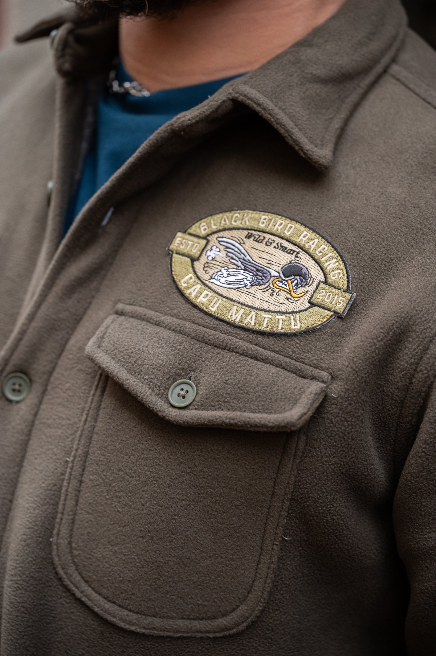 Pour donner à cette surchemise la petite touche qui va bien, nous avons rajouter un patch brodé Black Bird Racing fait main et cousu par notre couturière… histoire d’être dans la tendance de cette saison mais avec ce petit + qui fait la différence.