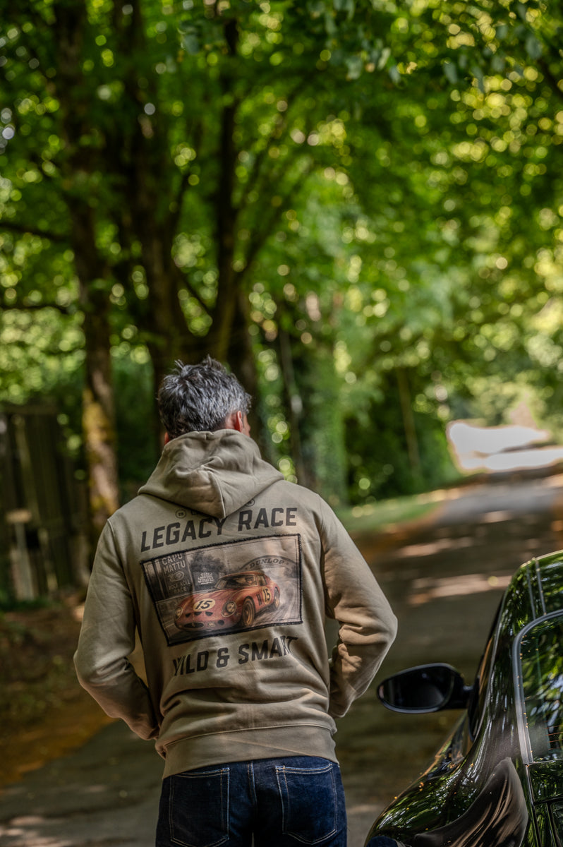 Pensé pour accompagner les amateurs de course, de style et de liberté, le sweat à capuche "LEGACY RACE" associe confort et caractère visuel fort. Dans le dos, un patch exclusif représentant une Ferrari 250 GTO vintage lancée sur circuit , entre légende et mouvement graphique. L'illustration, travaillée dans un esprit racing rétro, rend hommage aux années glorieuses des courses automobiles.