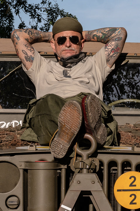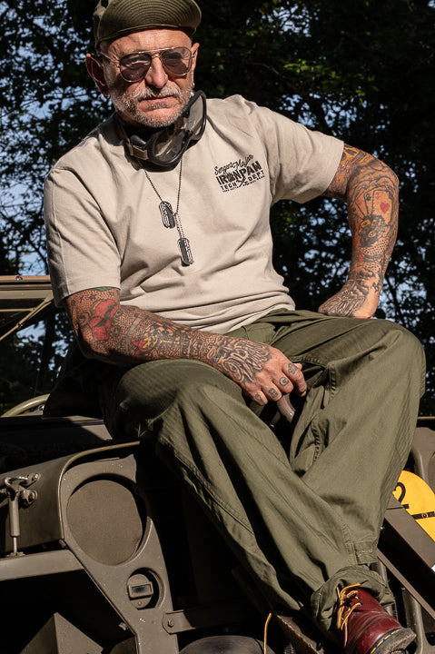Le t-shirt Iron Paw en couleur stone rend hommage au sergent-major Andy Micklin et à son unité de maintenance avancée de l’US Army pendant la Seconde Guerre mondiale.