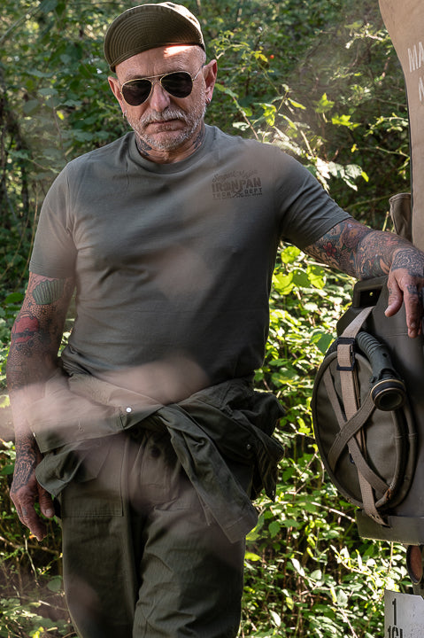 T-shirt Ironpaw, T-shirt coton bio kaki, T-shirt mécanique vintage, T-shirt custom garage, mode éthique militaire, T-shirt néo-vintage Capu Mattu.