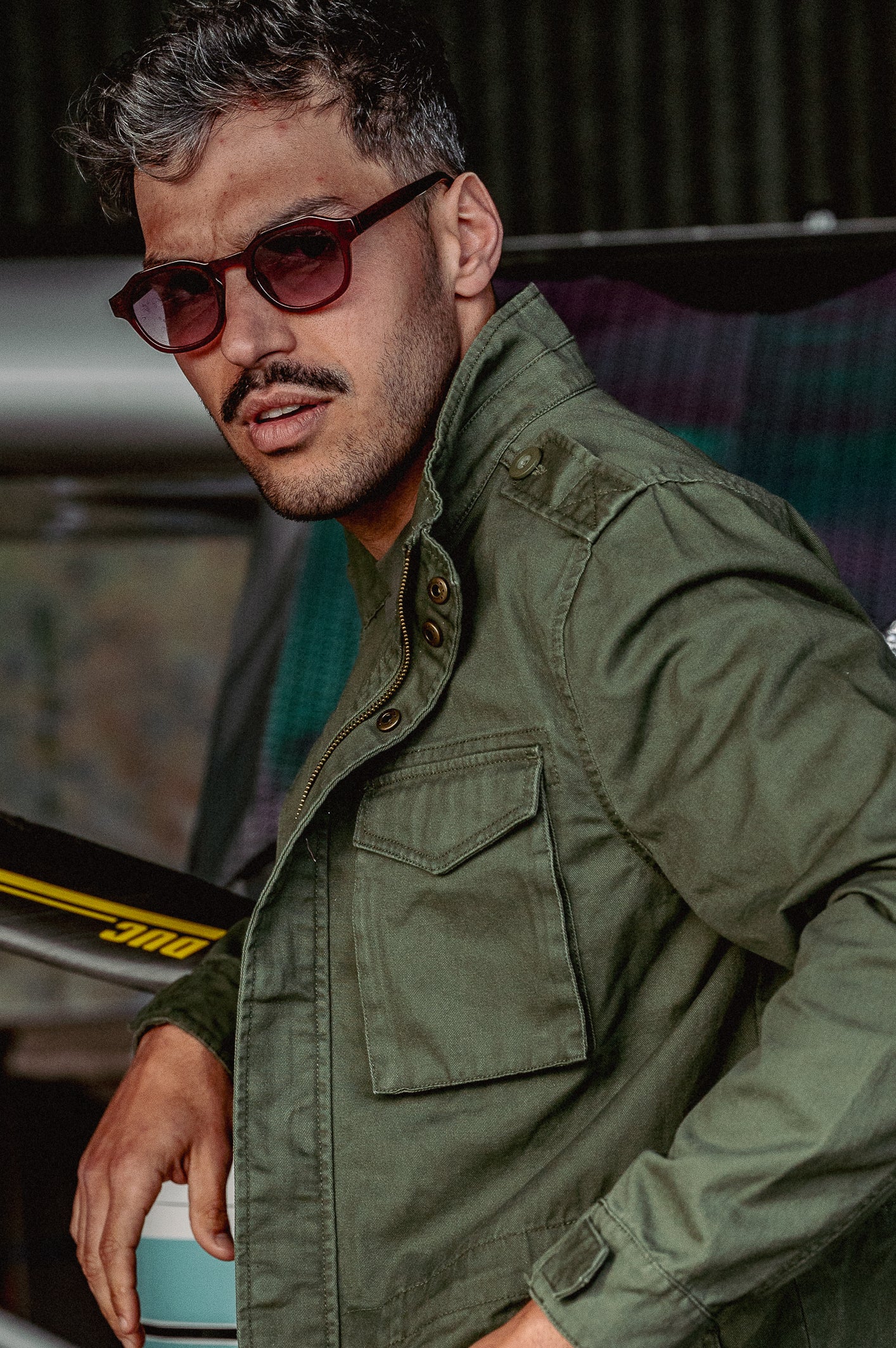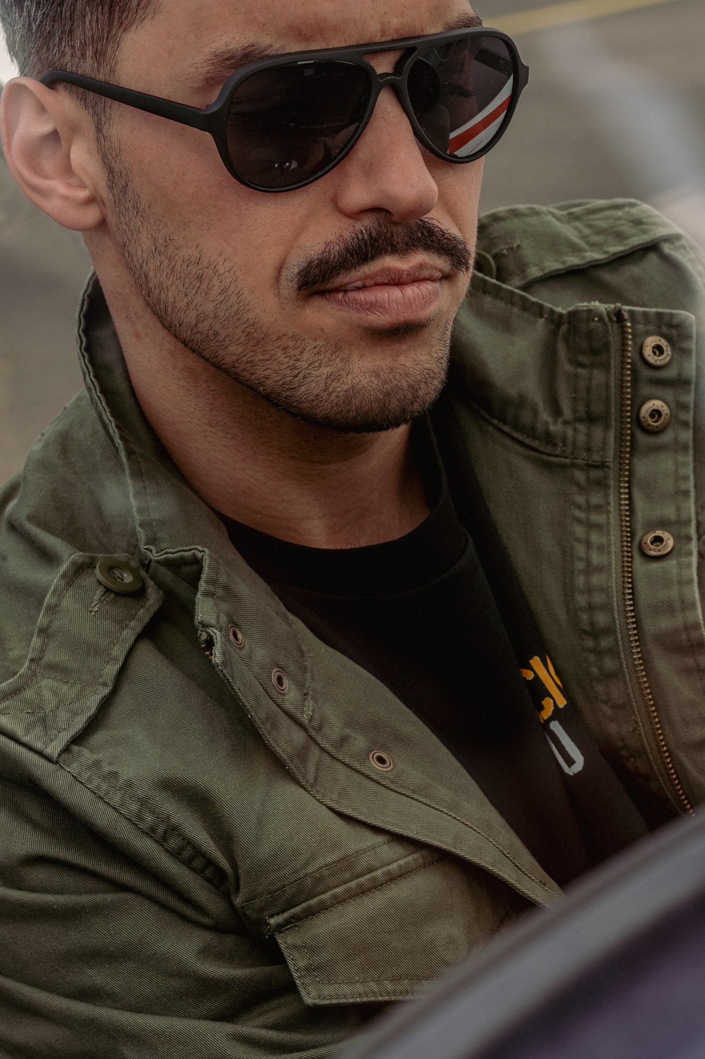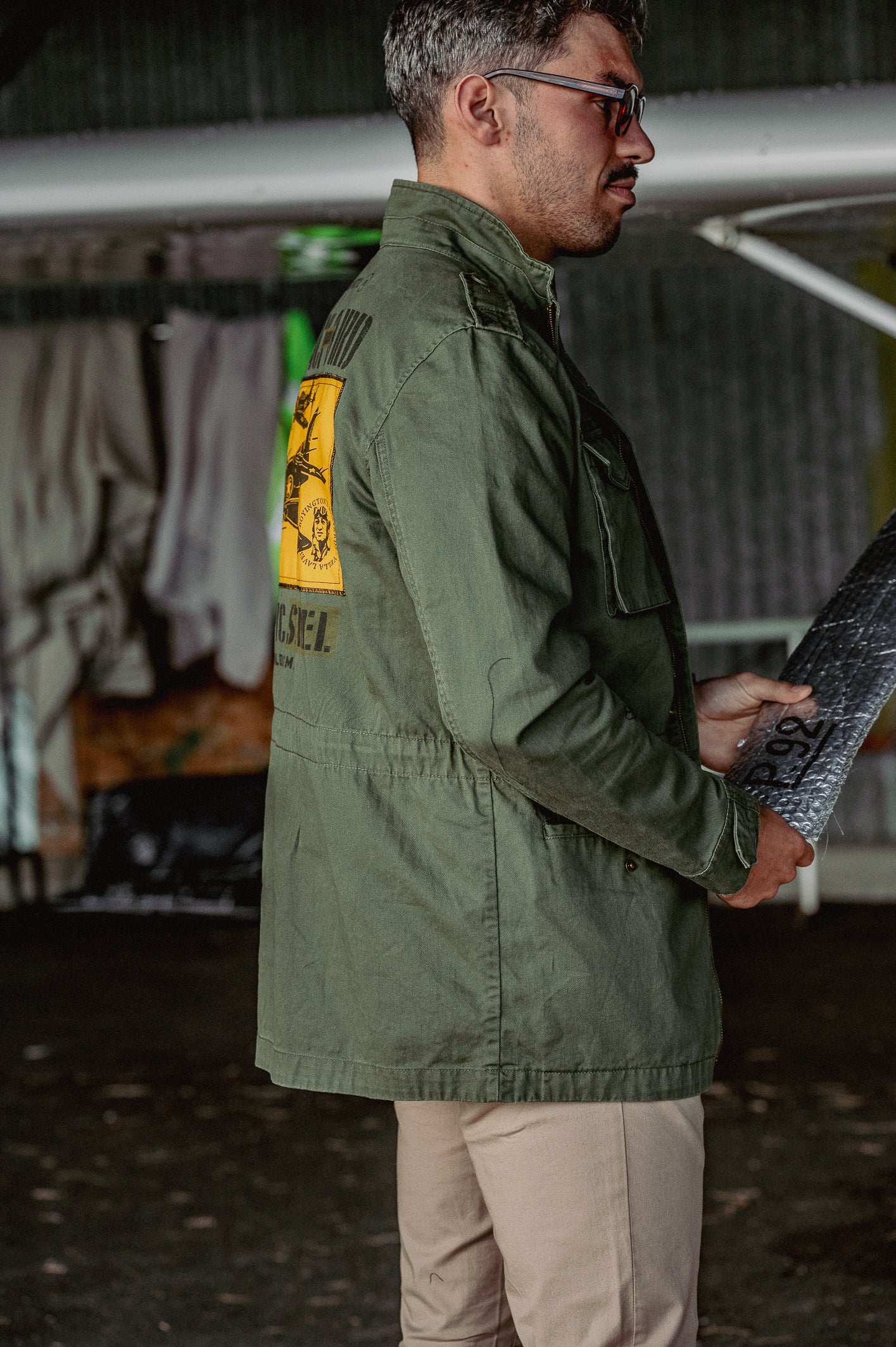 C'est une veste de type safari de couleur kaki, avec le visuel Black Bird Squadron en hommage au 80 ans du débarquement mais aussi à la fameuse Black Sheep Squadron plus connue sous le nom de tête brûlée, série des années 70 avec comme acteur principal Robert Conrad… Il en fallait pas plus pour s'en inspirer.